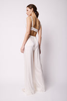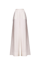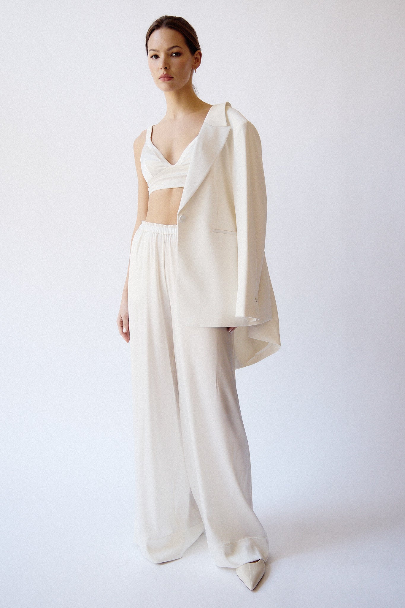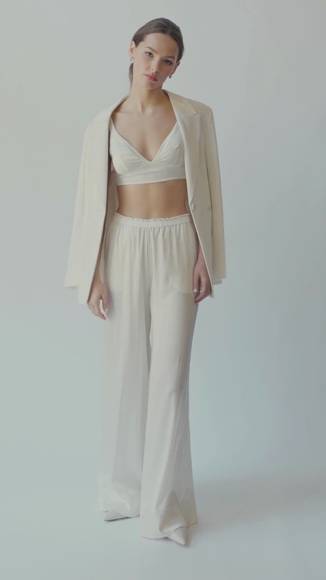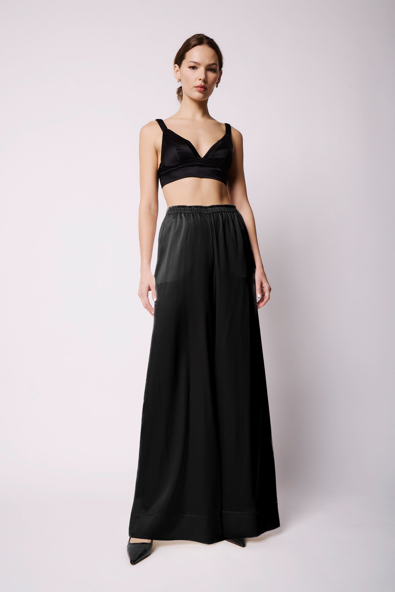 The effortlessly chic Lourdes Trouser, made with eco French stretch silk satin, features a relaxed fit, wide leg silhouette, mid-rise, side pockets and a paper bag style elasticized waistband. Pair it with the Fiamma Bralette or the Sensory Bodysuit and top it with your favorite blazer.